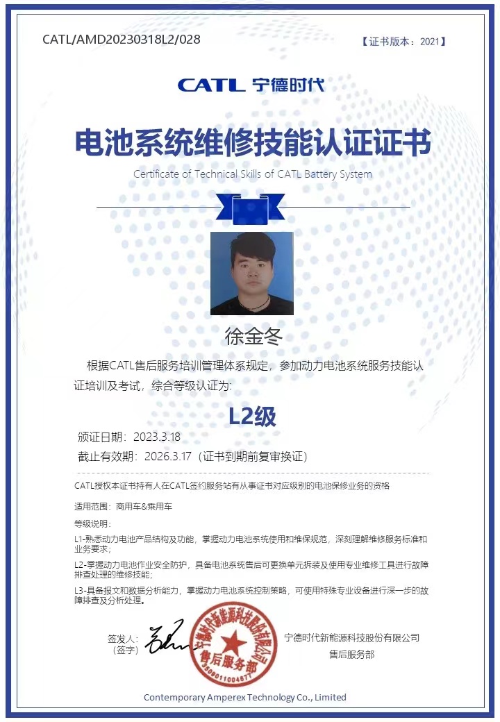 此次培訓選派張強、徐金冬兩名一線維修人員參加寧德時代在武漢舉辦的《鋰動力電池》L2-A培訓,培訓分為理論和實操,理論課內容涉及認識商用車電池系統、電池均衡;實操課涵蓋了商用車上位機使用、安全作業防護與基本維修流程、充放電作業、商用車電池箱深度拆裝等重點內容,參培人員利用5天的時間,參加培訓的人員認真學習,在實操訓練中逐步熟悉和掌握電池拆裝及使用專業維修工具進行故障排查處理的維修技能,最終通過理論、實操考核工作,獲得了寧德時代頒發的L2級維修技能等級證書。