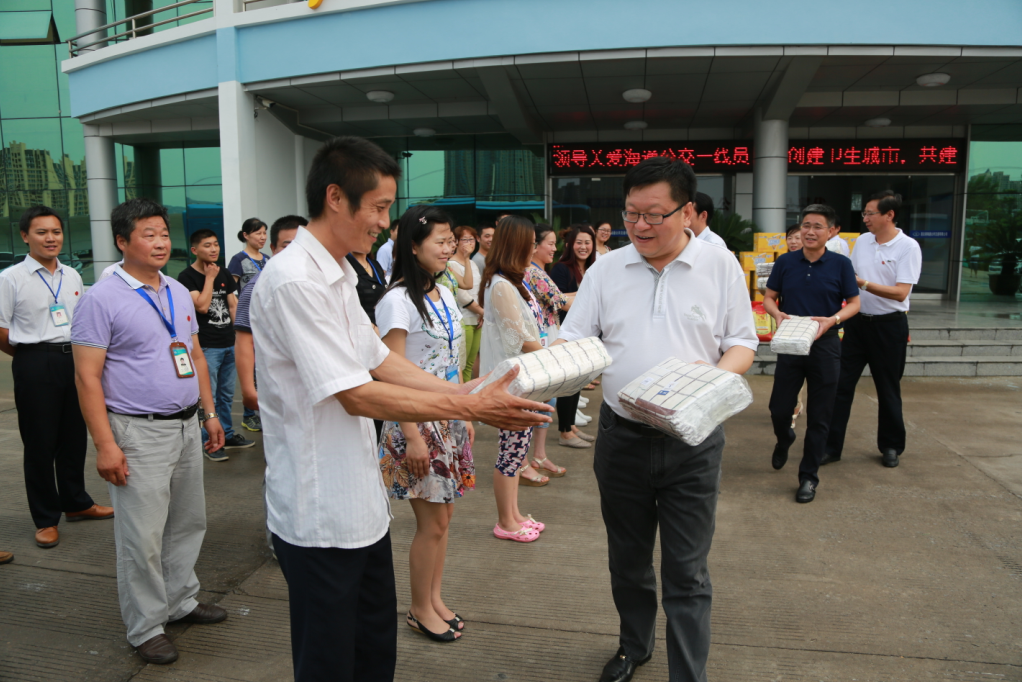 7月26日下午,交通控股集團黨委書記、董事長劉永能,黨委副書記、總經理仲偉濤,工會主席王中永等集團領導冒著高溫來到海通公交公司,親切看望慰問了高溫下堅守崗位的公交一線員工,為他們送去綠豆、白糖、純凈水、飲料等防暑降溫物品,并叮囑他們注意防暑降溫,以良好的狀態投入到工作中去,做好安全服務工作,服務好廣大乘客。劉永能等領導叮囑隨行的公交公司領導,一定要關心員工的身心健康,尤其要做好夏季的防暑降溫工作,把“送清涼、送安全、送法律”活動落到實處,讓廣大員工真正感受到組織的關愛。