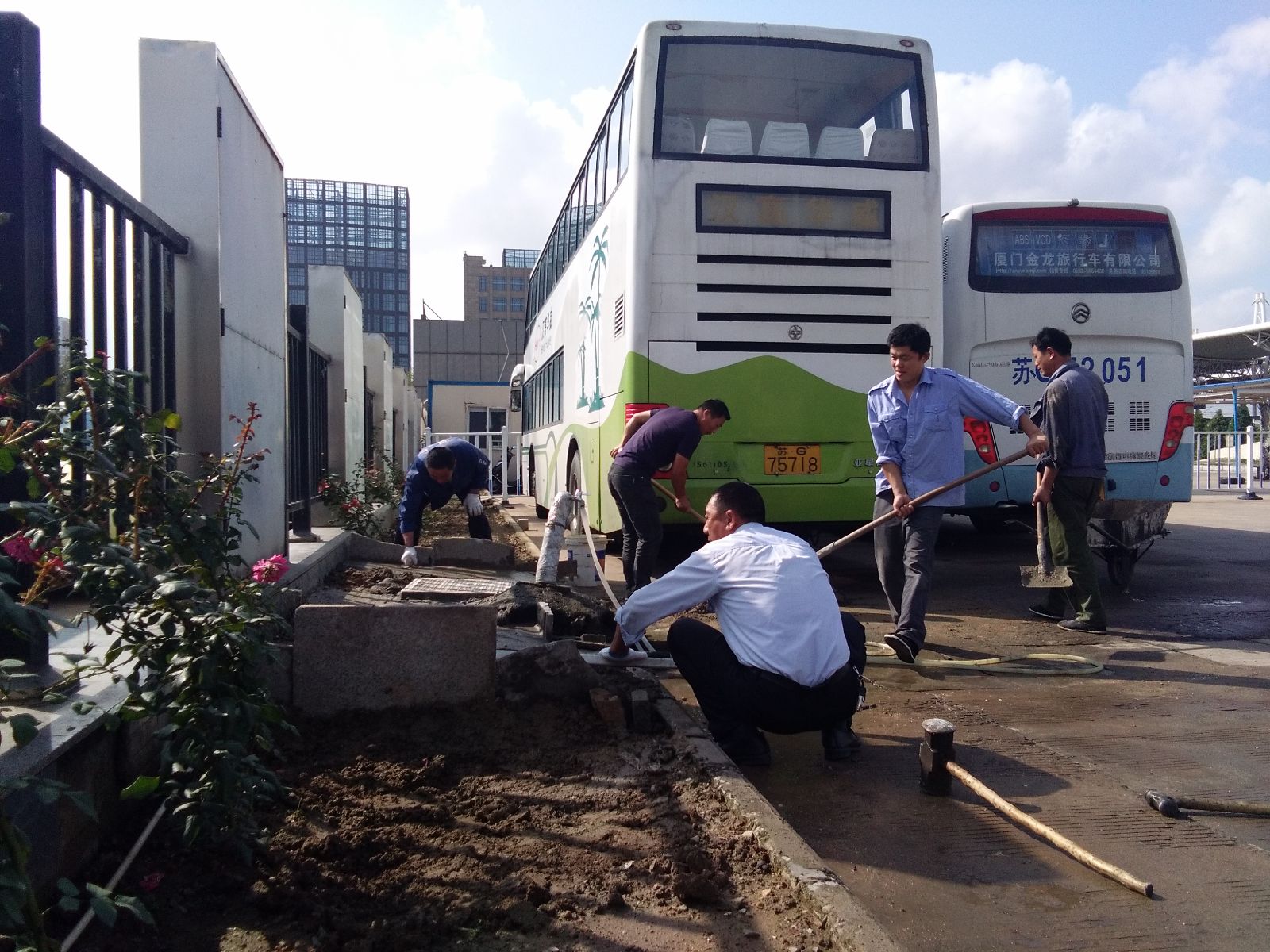 10月18日,公交東部公司機(jī)務(wù)科科長陳家廷帶領(lǐng)機(jī)關(guān)管理人員、外包修理人員平整公司總站停車場自來水管周圍的平地,他們分工明確,有的用車子運(yùn)河沙、有的用錘子搗碎石頭、有的攪拌水泥、有的用抹子將水泥面抹平……,大家自己動手,建起了清洗水泥臺面,為日常清洗抹布、清洗座位套等提供了極大的方便,為創(chuàng)衛(wèi)助力。