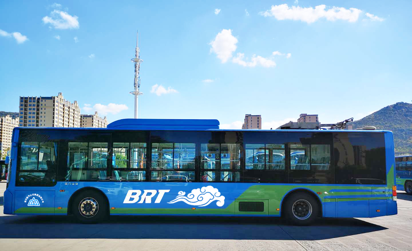 連云港公交車身整體為藍色,代表著大海和廣闊的天空,綠色造型代表海鷗,翱翔在藍天和大海之上;綠色凸顯清新和盎然生機,也表達了綠色公交的發展理念。祥云是中國傳統的吉祥圖案。碧海藍天、海鷗祥云相得益彰,勾勒出一幅“海鷗飛處祥云追”的祥和畫卷。也體現出現代公共交通服務民生的和諧美好。